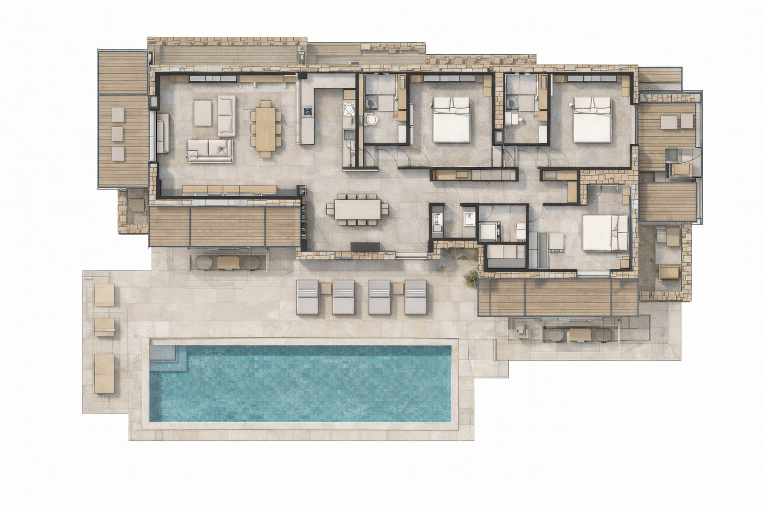 Locally sourced stone forms the primary building material, selected for its durability, thermal performance, and visual continuity with the island’s geological identity. The stone masonry is assembled using traditional techniques practiced by local craftsmen, ensuring both authenticity and longevity. This approach not only preserves regional construction knowledge but also reinforces a strong connection between the building and its cultural context. Complementary materials, such as natural timber, lime-based renders, and shaded metal structures, are chosen for their resilience to the Mediterranean climate and their understated aesthetic.